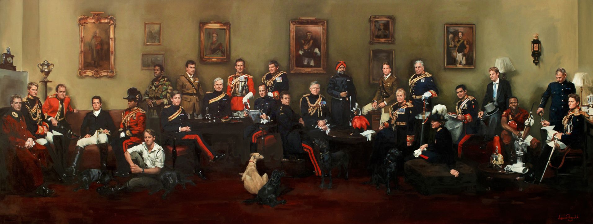 It is a modern version of an original 1857 painting. At 3 metres long, it features 25 officers serving with the Household Cavalry.