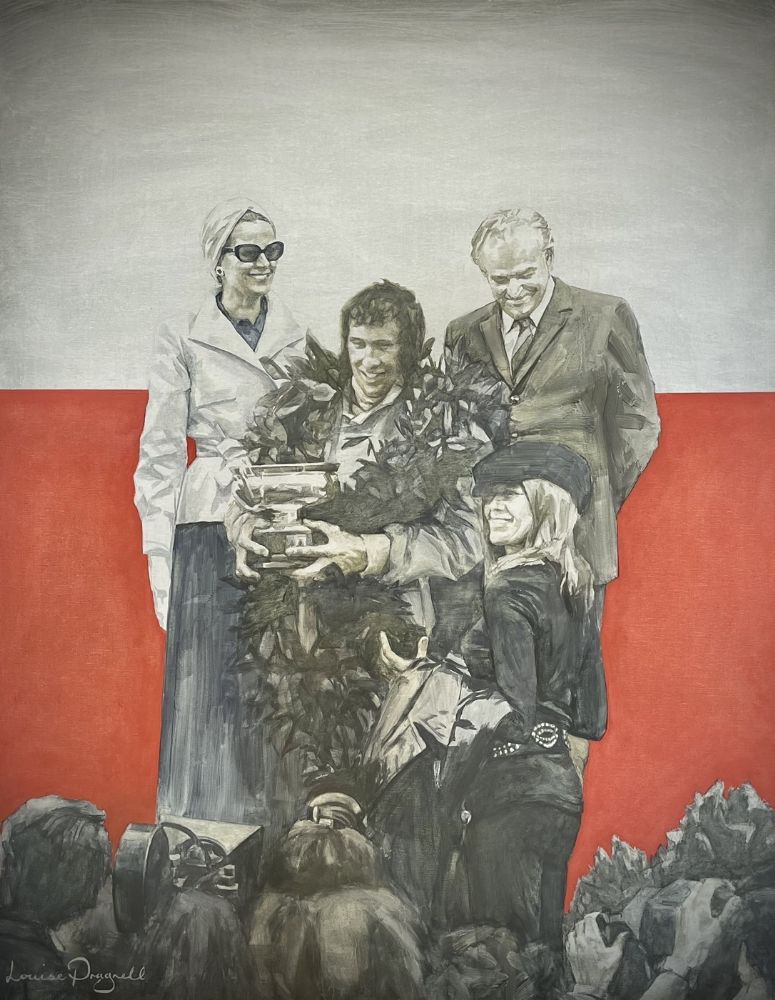 "The brief was to depict Sir Jackie alongside Lady Helen Stewart, Their Royal Highnesses Princess Grace, and Prince Rainier. In learning more about Lady Helen's crucial role through Sir Jackie's career and life, it seemed important that this painting also serve to record their inspiring partnership and devotion to one another. My aim was to capture the atmosphere and the glamour of these moments and this era, with the tone and character of a time-worn image. To honour the sheer courage of the racing driver, the painting also had to be bold. The red background acts as a nod the Monaco podium, red carpet and of course the Monacan flag.”